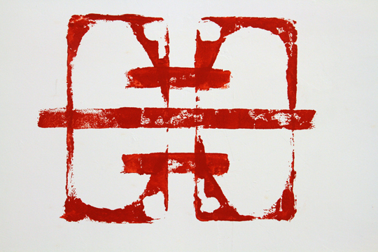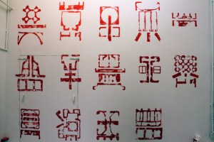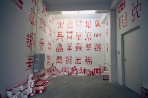 I traveled to Beijing for an artistic residency to investigate and develop a project involving the industrial detritus of the region. My first finding was that industrial zones were not in central Beijing but in the periphery of the city or neighboring —yet inaccessible— towns. Therefore I started exploring the close surroundings and found people driving tricycles packed with cardboard, metal, aluminum cans, polystyrene, and other materials: I followed them. I wanted to find out where were they taking such stuff. My followings took me to big recycling depots in the middle of my neighborhood. I found that Beijing’s population recycles everything: metals, cotton, wood, foams, plastics, etc. This was my first trip to China; I spoke not a single word of Mandarin and was incapable to read their characters. I guess this provoked the forms and graphic features in them to influence my perception. In one of my regular visits to the recycling depots, I found discarded polystyrene packaging and realized that the shapes adopted by the polystyrene were similar to the characters in Chinese and Japanese stamps and seals. The impression cooked in my dream, and when I woke up I started sketching. Working with the scavengers, following them, trying to communicate by whatever means —signs, drawings, cut words in English— allowed me to collect a large amount of polystyrene packs, which I used to stamp all over the gallery wall. My random yet rhythmical composition induced visitors to try to ‘uncript’ what turned into some type of writing.